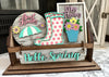 This wagon shelf sitter would make a great addition to your spring decor! The best thing about it is you can use the wagon for other holidays! The inserts and sign are removable, so you can arrange them however you would like! Another wonderful thing is most of the inserts from the wagon fit in the shelf sitter too!